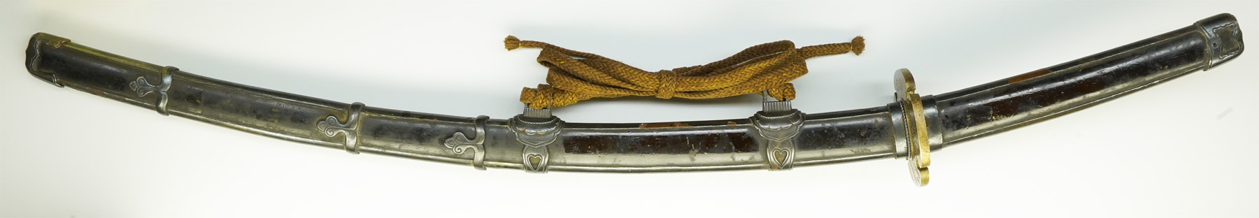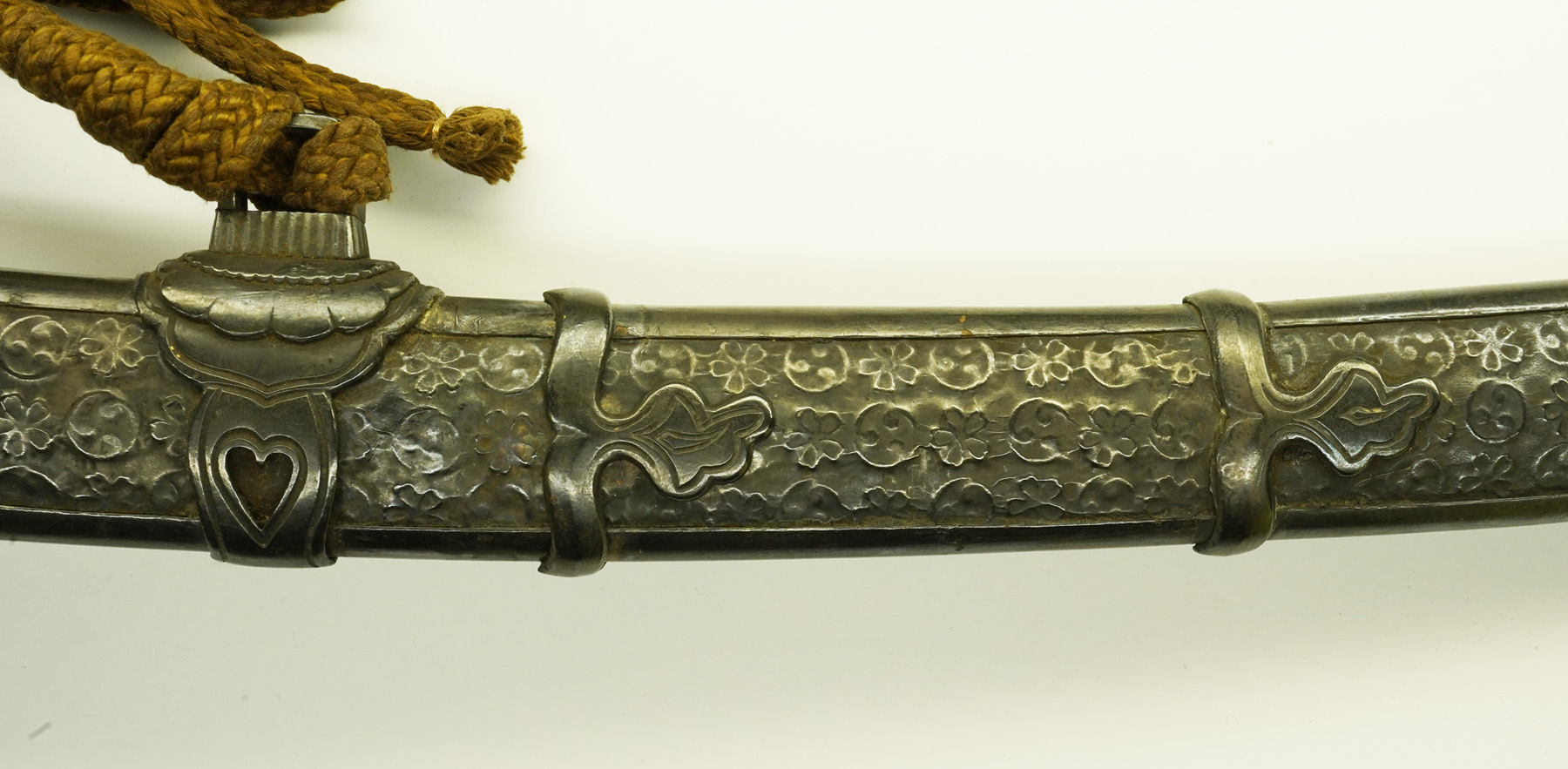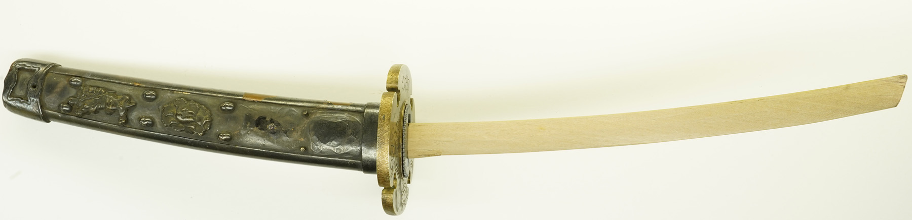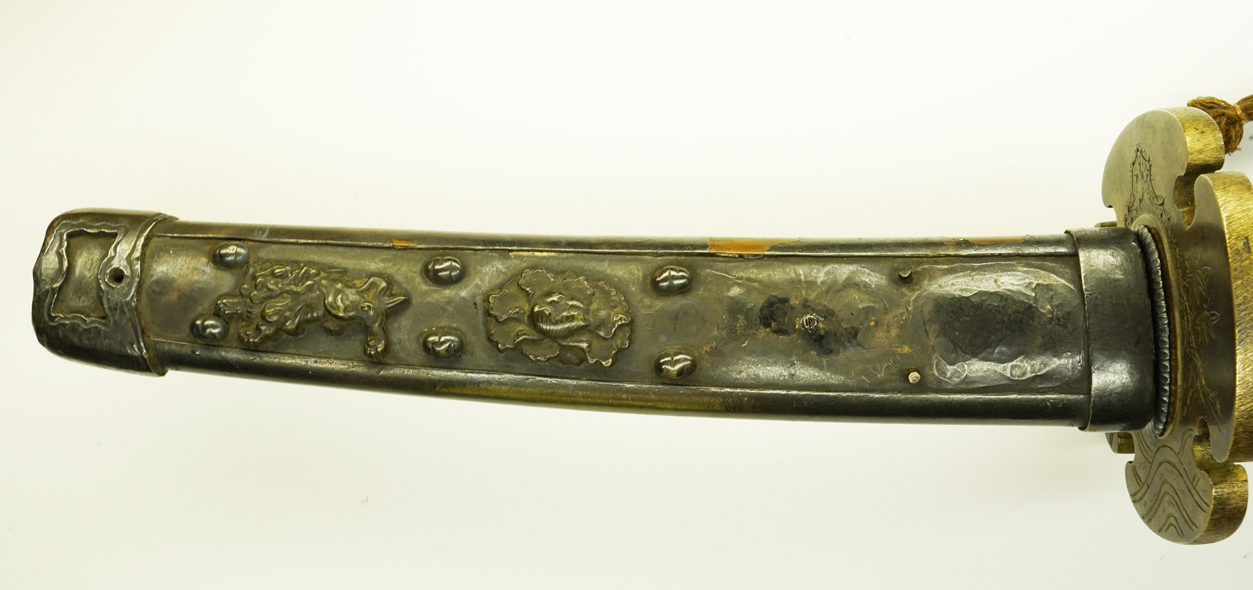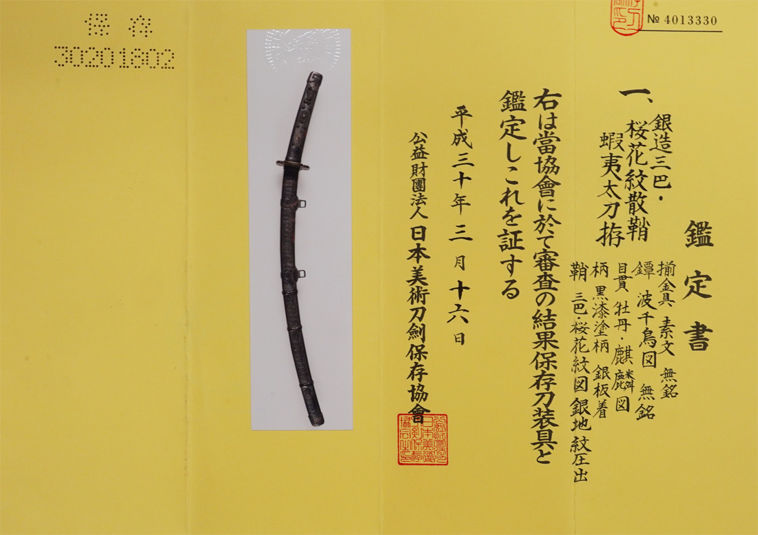 本作は下地に黒漆を塗り、その上を三巴・桜花紋を凸凹状に打ち出した白銀地を、のし包み状に鞘に巻き付け、拵え全体に覆輪を施しています。 鐔は真鍮地に波千鳥図、柄前も白銀地を、のし包み状に巻き付け、麒麟図と牡丹図の蝦夷目貫が二個付きます。(目貫一つ欠損)