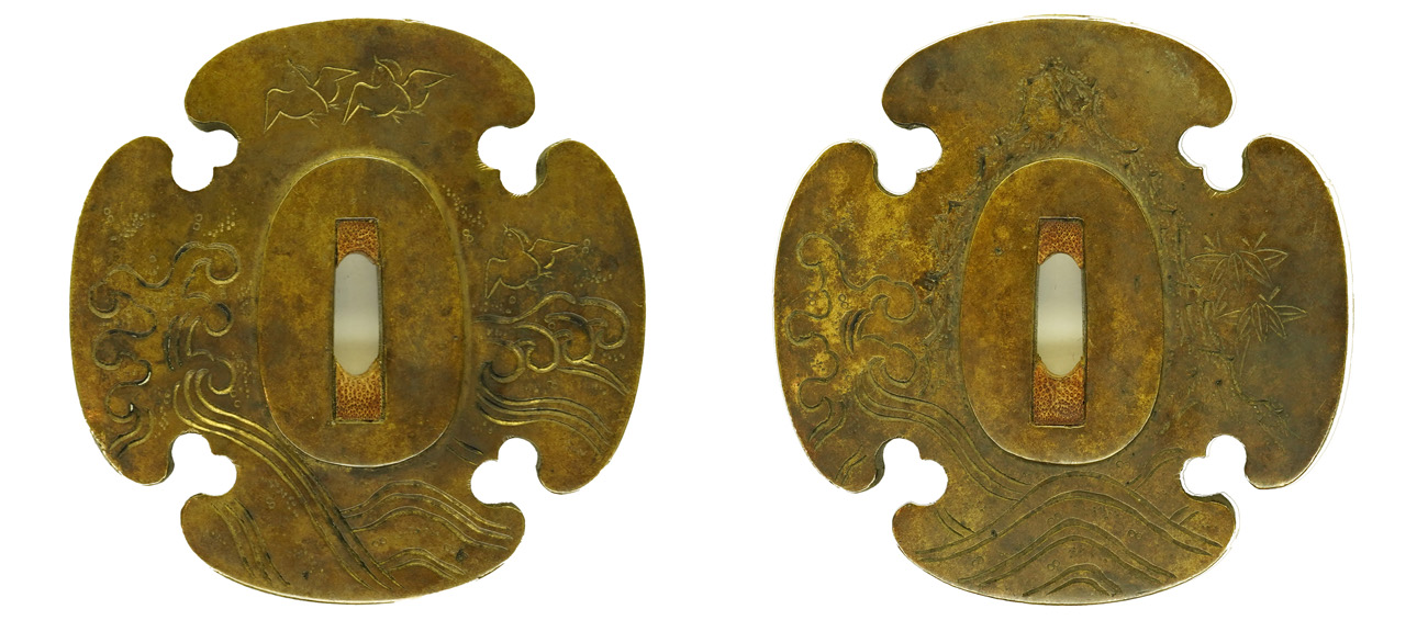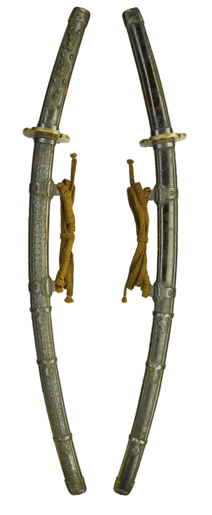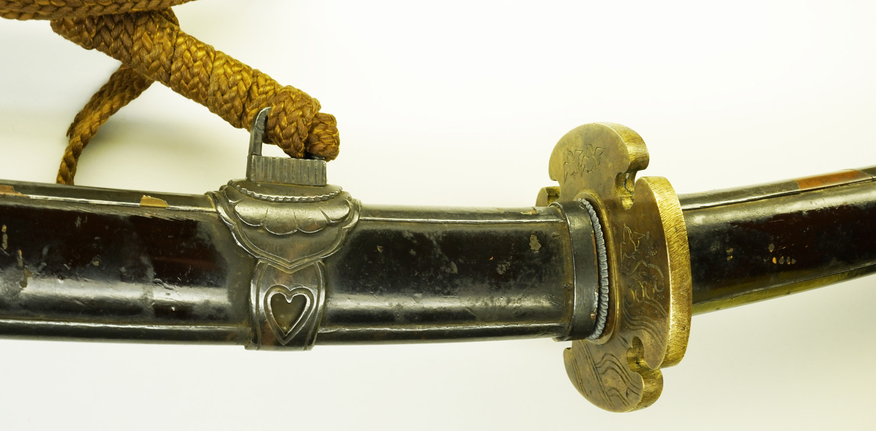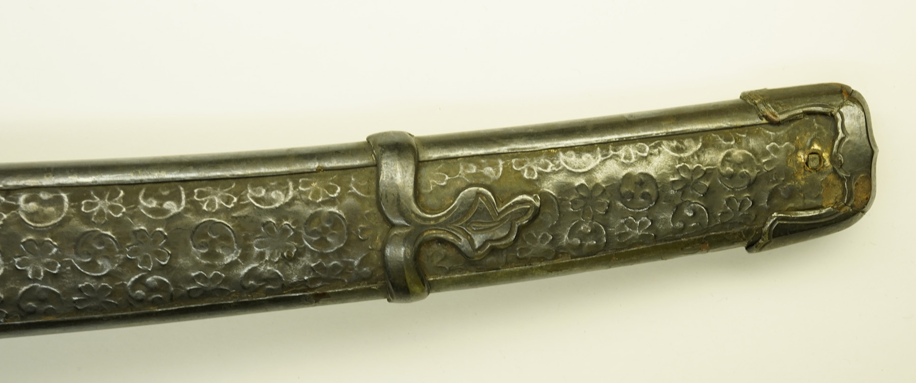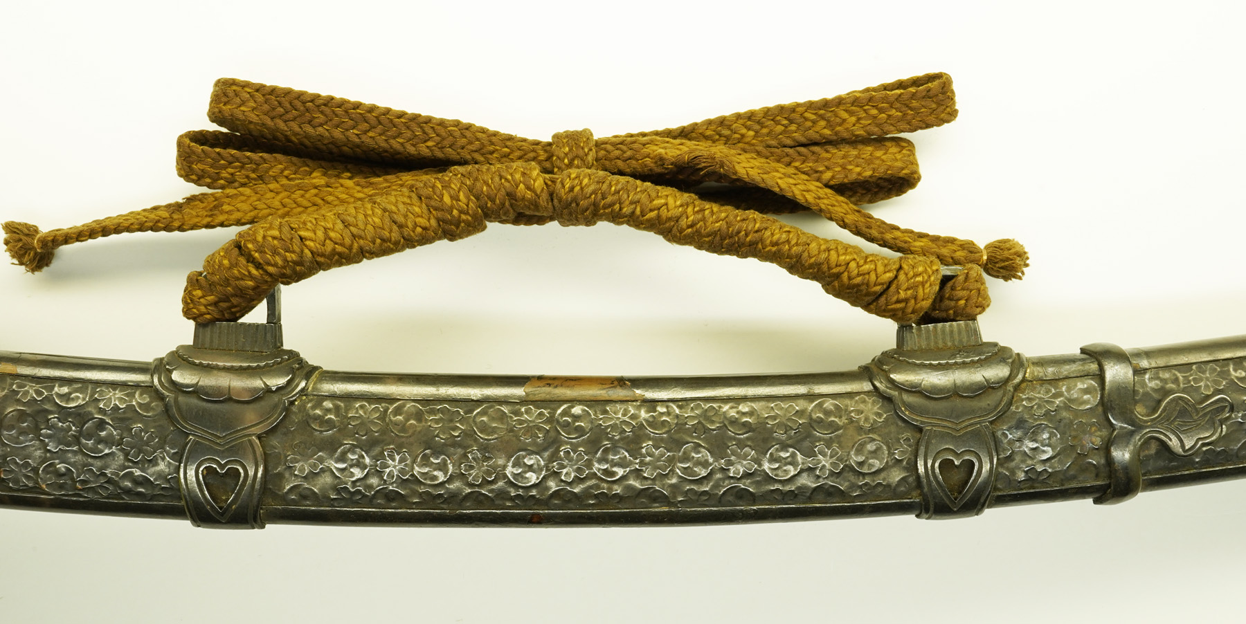本作は下地に黒漆を塗り、その上を三巴・桜花紋を凸凹状に打ち出した白銀地を、のし包み状に鞘に巻き付け、拵え全体に覆輪を施しています。 鐔は真鍮地に波千鳥図、柄前も白銀地を、のし包み状に巻き付け、麒麟図と牡丹図の蝦夷目貫が二個付きます。(目貫一つ欠損)