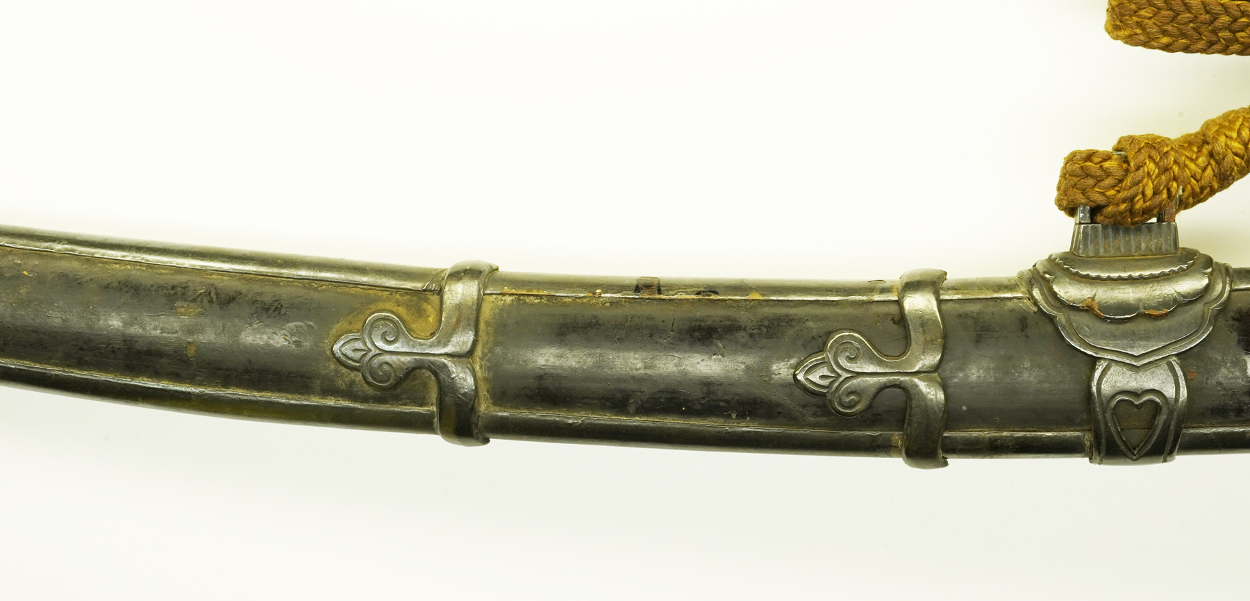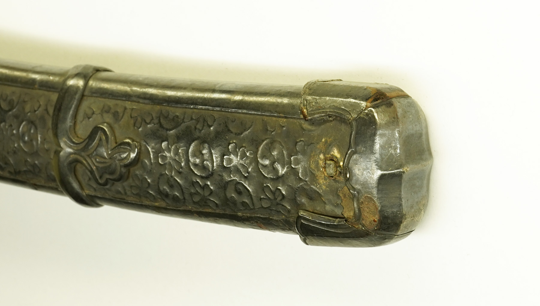 鞘は足金物が二箇所・責金が三箇所つき、白銀に施された色絵の輝きは、長い年月を経て変色し、その質素な色合いは、日本文化特有の美意識へと繋がります。その美を求めて江戸時代は逆輸入し、鑑賞の対象としてきました。 蝦夷拵は現在、国立博物館と北海道大学植物園に2点、えりも町郷土資料館に2点、民族共生象徴空間に数点が伝世しており、アイヌ文化を未来に伝えるための貴重な資料となっています。