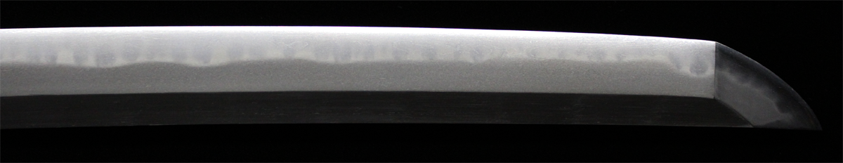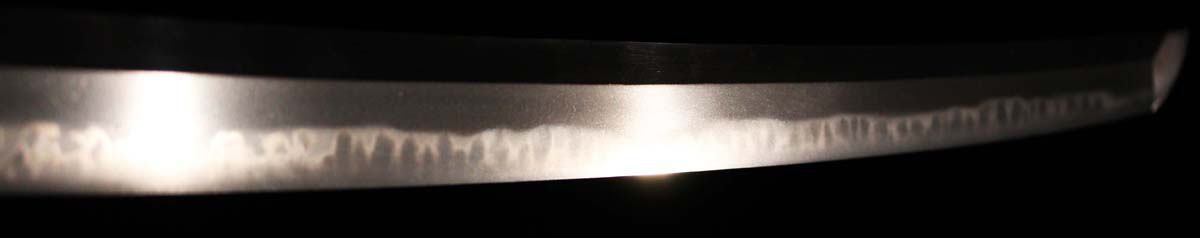 鎬造り、庵棟、身幅広く、中切っ先つまり猪首切っ先となる堂々たる姿、板目肌約み細やかな地沸つき、刃文匂深い華やかな丁子乱れで、重花丁子、袋丁子、所々互の目混じり、足、葉良く入る。 物打ち辺より焼幅を狭くし、帽子乱れ込んで浅く返る、茎生。