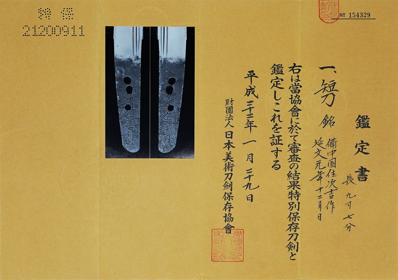 本作の次吉は、南北朝時代の中青江を代表する、次直・守次などと並ぶ名工です。中青江の作風は、直刃と逆丁子乱れの二様があり、同派の特徴として匂口がしまり、明るく冴えるのが見どころとなっています。