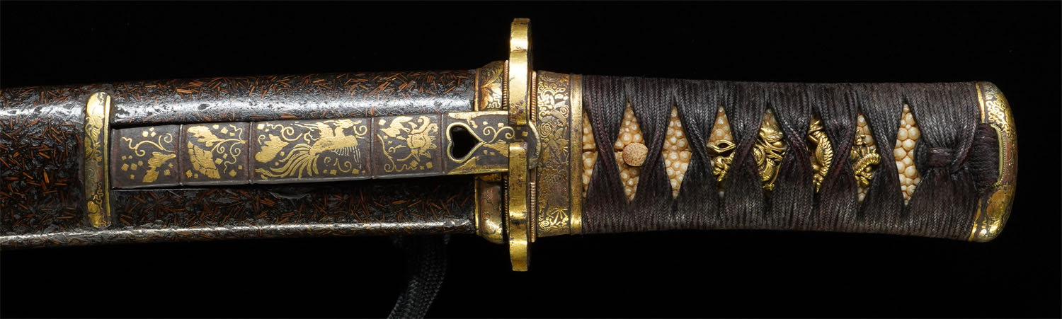 拵えは、鉄地に隙間なく桐鳳凰図の金象嵌を施した、江戸時代の豪華な短刀拵えが附属します。
