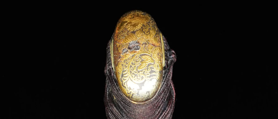 杢目を交じえて板目流れ、よく練れた地鉄には、地沸がつき、地景入り、腰開きの互の目に、飛び焼きも交じり、履表には倶利伽羅龍(剣巻き龍)を彫り、裏には武運を願う、八幡大菩薩 の五文字を彫り入れます。末備前の彫刻が間が延びしているのに対して、本作は寸の詰る刀身に、寸の詰る龍を緻密に彫り入れ、注文主の願いが表れています。帽子は表は小丸、裏は淡く履掛けます。