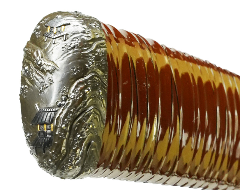 会津兼定家の先祖は美濃国の名匠、和泉守兼定(之定)と言われ、会津領主の芦名氏に招かれます。二代目は当時の会津藩主・蒲生家に仕え、後に藩主となる松平家などの大名の御用を代々勤めて、連綿と明治期まで同銘十一代を数える名家です。十一代兼定は父である十代兼定の子として天保八年生まれ、初銘を「兼元」、十六歳で会津藩の御用を勤めて文久三年、京都守護職の任にある主君松平容保の在する京都にて修行し同年、和泉守を受領、兼定と改名します。同年文久三年は十四代将軍家茂が3月に上洛、その警護の為に結成された浪士組(新選組の前進)も京都に駐屯していました。十一代兼定と新選組隊士の交わりは、京都に於いて始まりました。新選組副長:土方歳三が所持して最後まで奮戦した際の愛刀は、兼定の傑作です。明治維新後も越後加茂などで鍛刀し、明治三十六年に六十七歳で没します。本作は平造り、重ね厚く、刃縁沸強く、よく詰んだ柾目肌は、大和保昌派の鍛えを髣髴させており、良く錬れた柾目鍛えに沿って、地沸が微塵に厚くつき、佩表には沸映りが鮮明に立ちます。刃文 匂口深く表裏の腰元に喰違い刃、湯走り、金筋、砂流しなど目立ち、物内より帽子にかけて荒沸よくつき、帽子 掃きかける。