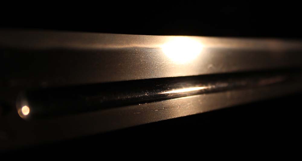 備州長船盛光は康光と共に応永備前の代表工で、鎌倉期の一文字派や長船長光を思わせるものもあります。板目に杢目を交えて肌立つ鍛えに、同派の特色が示されています。