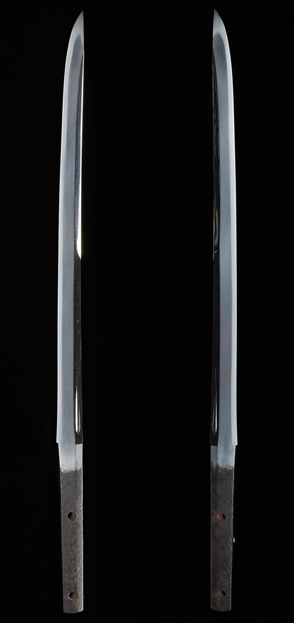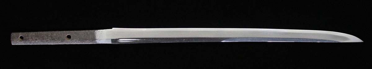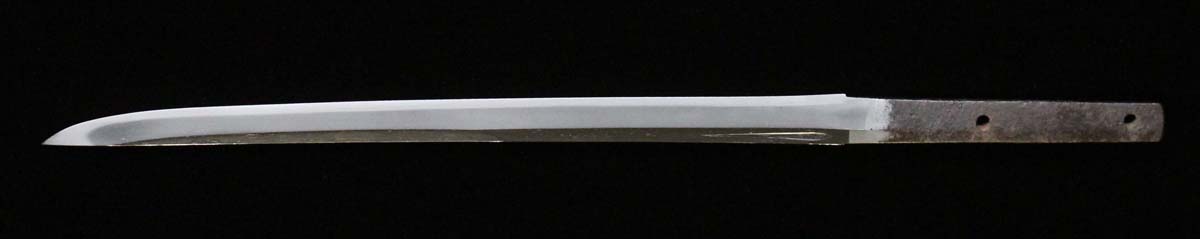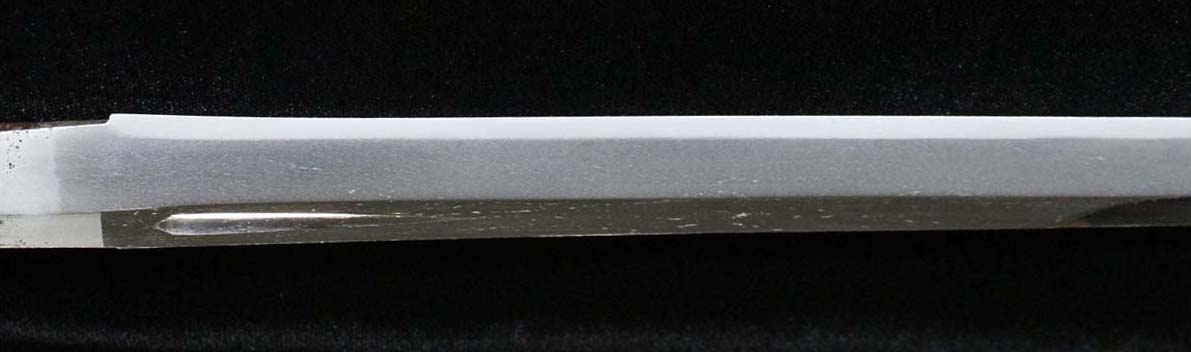 本作は、鋒には横手をつけない鵜の首造りとし、身幅が狭く、重ねが厚いのが特徴です。 茎(なかご)磨上。 焼刃は直刃仕立てにて、板目肌が流れ刃よりには、柾目肌が良く現れます。よく錬れた鍛えは梨地肌となり、地沸細かくつき、地景入り柔らかく九州肥後の地鉄です。
