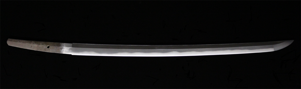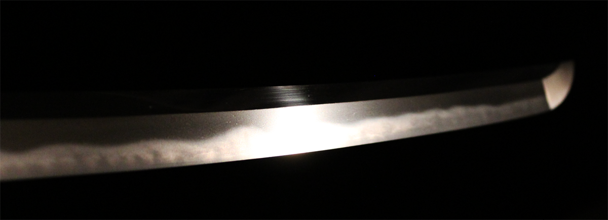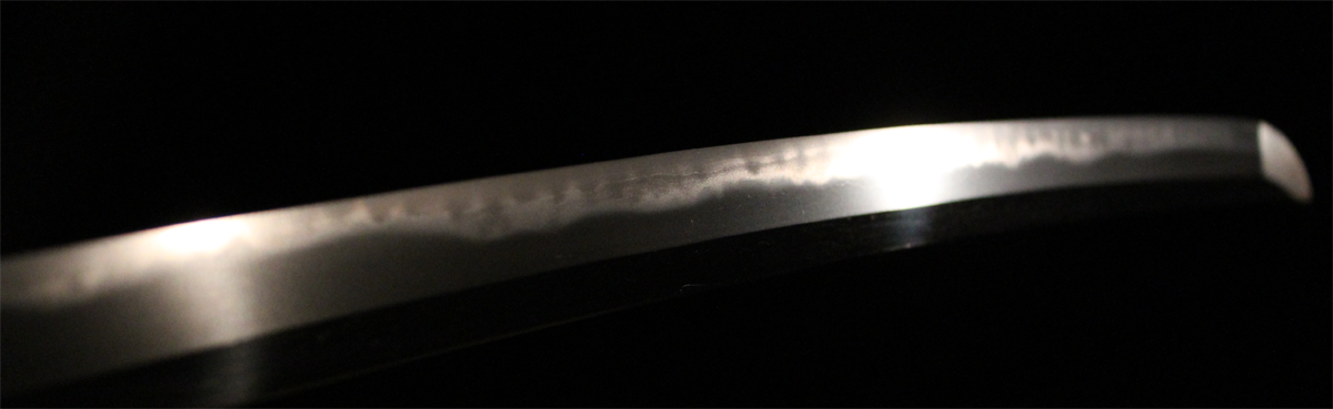 本刀は元先の幅差少ない、浅くのたれて互の目、小互の目連れ足長くよく入り、匂口深く砂流し随所に現れて覇気があり、板目に沸厚くつき地景入り、佩き裏ハバキ上に湯走りがかり、それが二重刃風をほどこしています。