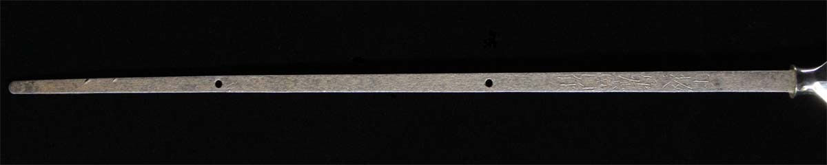 近江国(滋賀県)坂田郡下坂田村は、南北朝時代より近世まで国人領主の下坂氏が長く実行支配しており、下坂家・京極家・浅井家という戦国大名などの求めに応じて武器を制作していた鍛冶の祖が、下坂八郎左衛門入道と言われ鍛冶銘早見出にも「下坂鍛冶の元祖、時代・天正頃」と記載されています。越前初代康継の父とも兄ともいわれ、初代康継との関わり深い鍛冶です。 黒みをおびる地金は北国物特有の肌合となり、おそらく近江か越前にて制作された一振りで、のたれに互の目を交え、地沸厚くつき、地景よく入り、野趣溢れて出来が優れており、下坂の十文字槍の優品です。 中心:生ぶ、在銘 【御拵え入り】