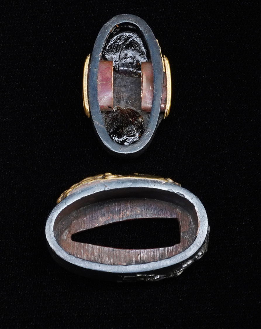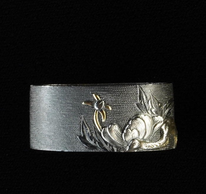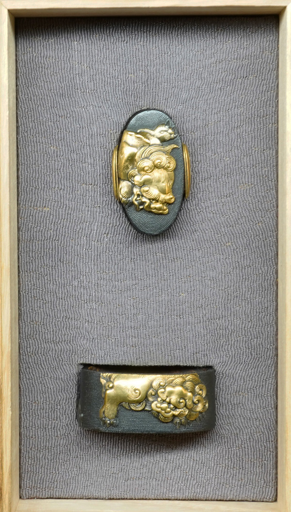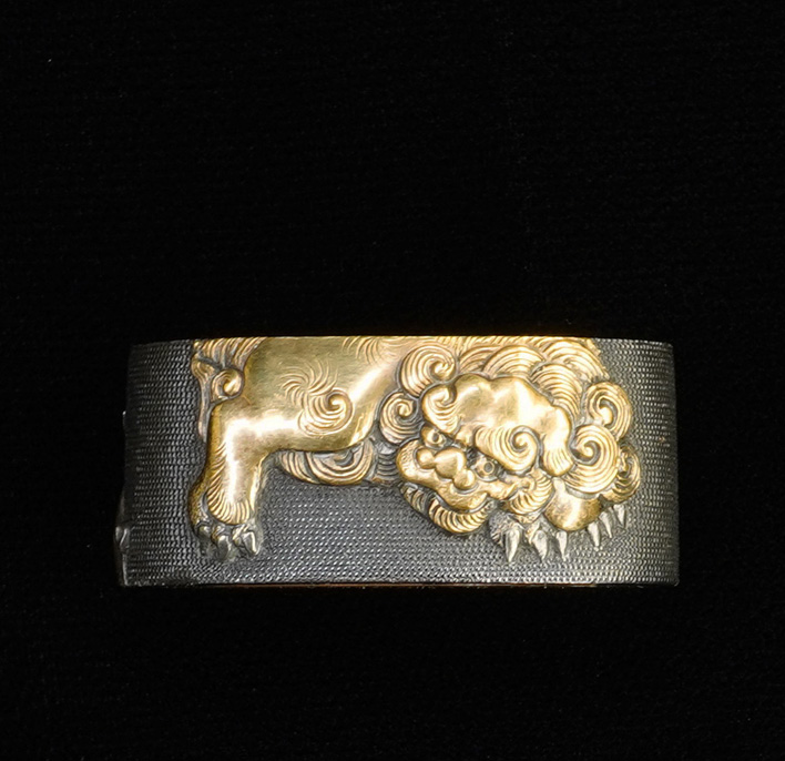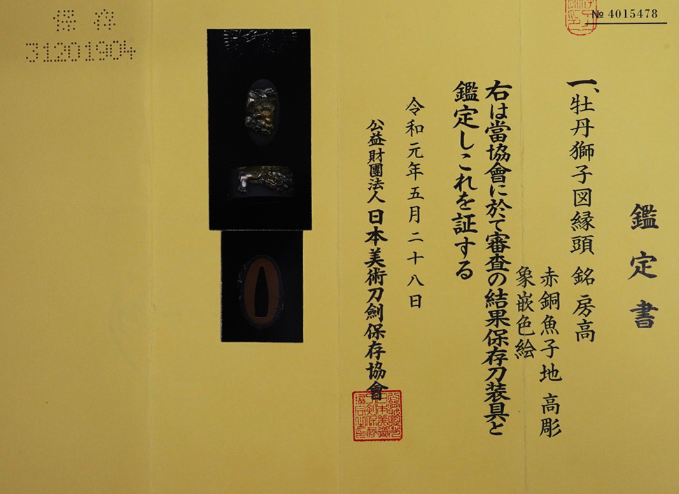 牡丹獅子図縁頭 銘 房高 (赤銅魚子地 高彫 象嵌色絵)