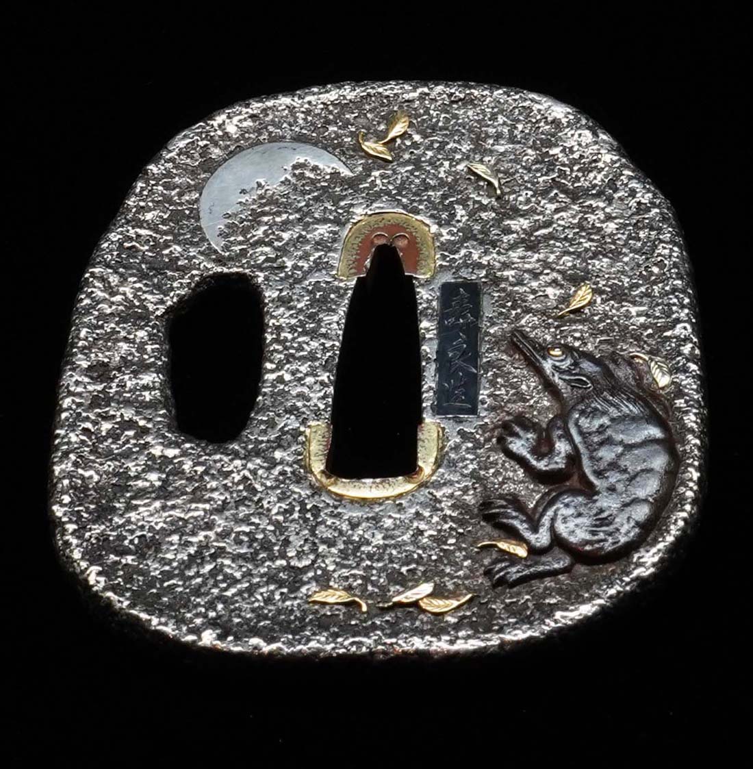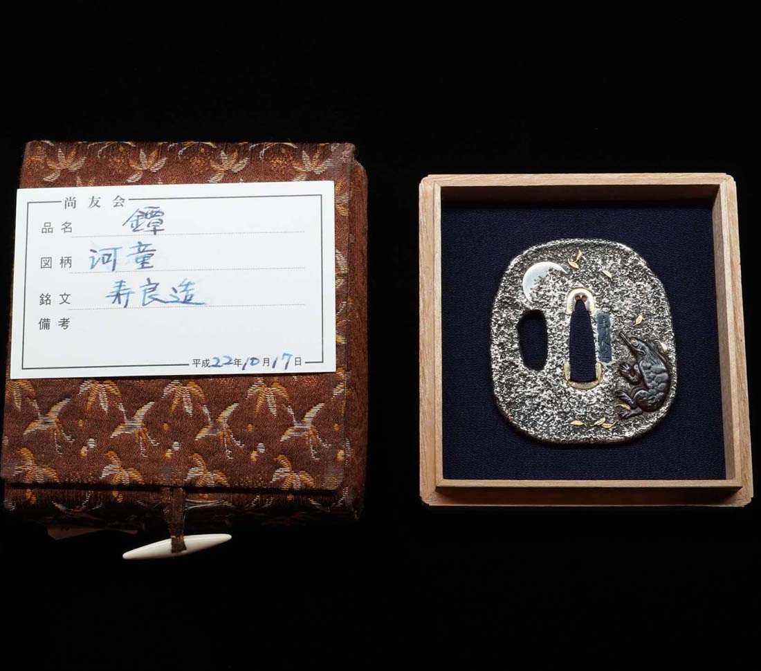 河の中から、月明かりに呼び寄せられ現れた川岸の河童は、月夜に僅かに照らされて、濡れた姿が艶やかに表現されており、裏の象嵌色絵も実に見事で、船着き場の木杭にも、江戸情緒があふれる景観となっています。 月夜の明かりを銀地に石目地の手法で巧みに表現し、また河童図は大変、珍重されているところから、名工の名に相応し名鐔です。