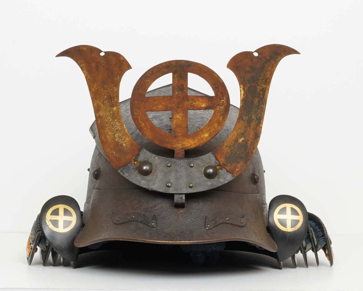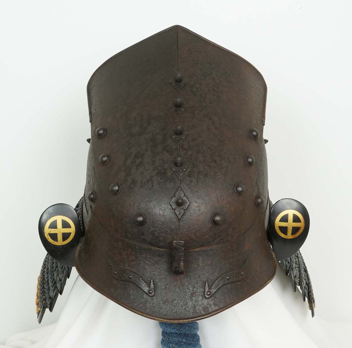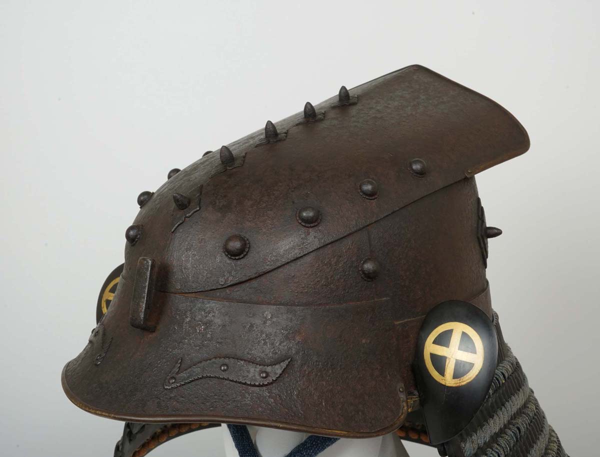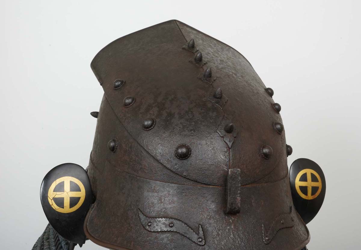 頭上に折り畳んだ手拭を置いたような形状から、置手拭形兜と呼ばれる変わり兜の一種で、主戦武器が火縄銃となる戦国時代に、高い軍事力を持った紀伊国の雑賀衆により製作されといわれます。 置手拭形兜は、火縄銃の弾丸を後方へ受け流すために改良された兜で、従来の兜よりも防御力に優れていました。 本作は両側面に三枚づつ鉄板を環状に継ぎ合わせ、その上に天辺の鉄板二枚を置き、鉄板の重なる部位に補強と装飾を兼ねた花菱模様の共鉄に、鋲頭を尖らせた五本の大型星鋲を力強く打ちます。 側面と後方にも大きさの異なる大型星座を三本打ち、頑丈に補強されています。 両側面の六枚の鉄板と天辺の鉄板の重なる部位にも、十本の丸鋲に座金を置き、大型鋲で鋲留を施しています。 眉庇には、雑賀兜鉢特有の切鉄(鉄片)による眉を打ち付け、吹き返しに武門の家紋を左右に据え、錣を鉄地黒漆塗日根野五段綴としています。 前立ての鍬形と中央の丸に十文字紋は、以前は金箔が施されており、前立台と鍬形は丸鋲で固定されています。 特筆すべきは、置手拭形兜の多くは、天辺の鉄板が後方に頭形に湾曲するのに対して、天上鉄板を湾曲させずに直線的にすることで、後方部分に隙間を設けて兜内の通気を良くする機能を設け又、天辺を斜め直線的にする視覚効果は、戦場に於いて猛々しく映り、自己を顕示するには充分な造形美も兼ね備えた異形な兜といえます。
