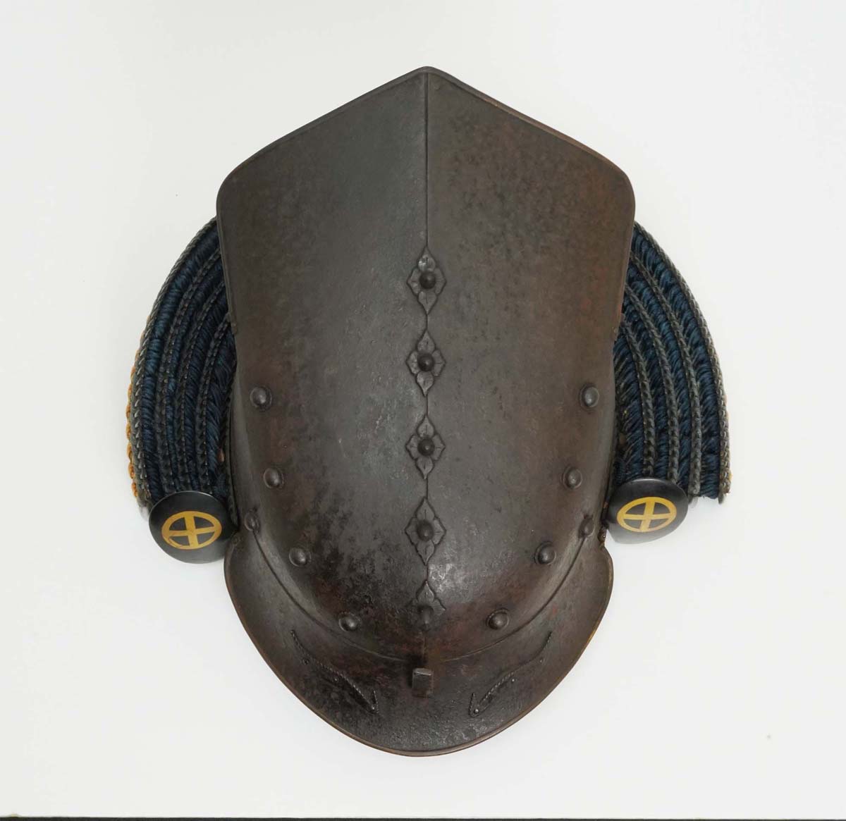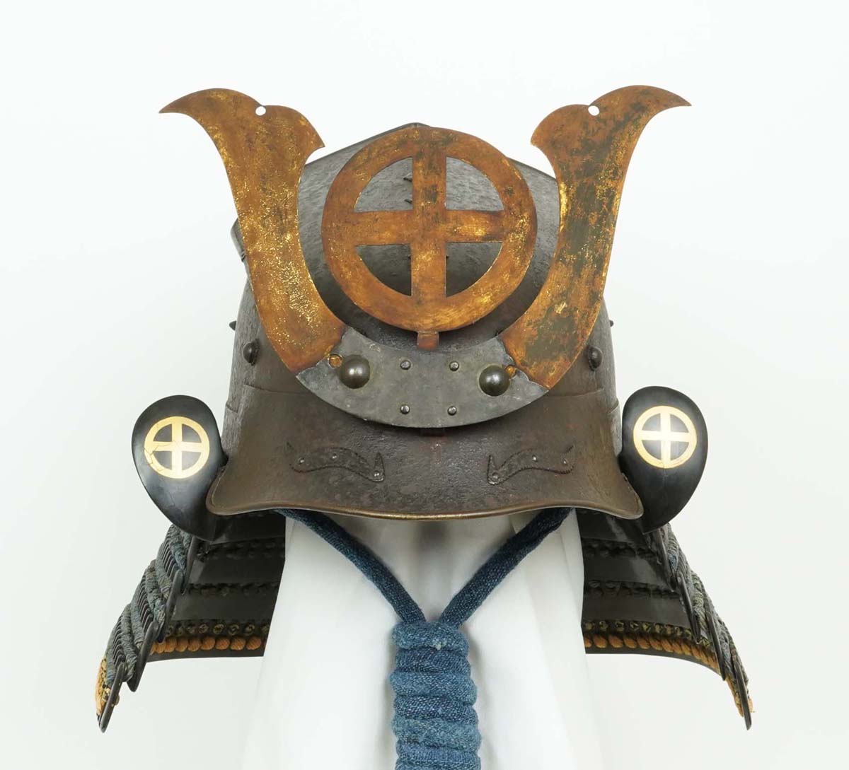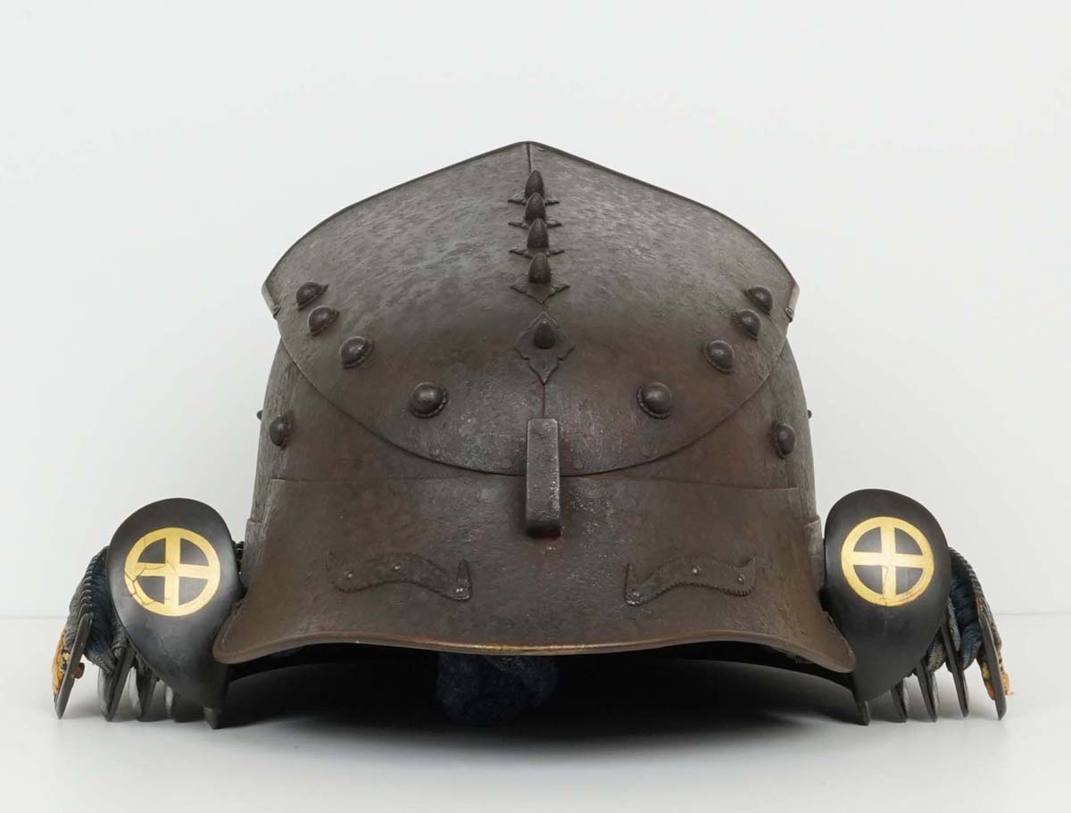 頭上に折り畳んだ手拭を置いたような形状から、置手拭形兜と呼ばれる変わり兜の一種で、主戦武器が火縄銃となる戦国時代に、高い軍事力を持った紀伊国の雑賀衆により製作されといわれます。 置手拭形兜は、火縄銃の弾丸を後方へ受け流すために改良された兜で、従来の兜よりも防御力に優れていました。 本作は両側面に三枚づつ鉄板を環状に継ぎ合わせ、その上に天辺の鉄板二枚を置き、鉄板の重なる部位に補強と装飾を兼ねた花菱模様の共鉄に、鋲頭を尖らせた五本の大型星鋲を力強く打ちます。 側面と後方にも大きさの異なる大型星座を三本打ち、頑丈に補強されています。 両側面の六枚の鉄板と天辺の鉄板の重なる部位にも、十本の丸鋲に座金を置き、大型鋲で鋲留を施しています。 眉庇には、雑賀兜鉢特有の切鉄(鉄片)による眉を打ち付け、吹き返しに武門の家紋を左右に据え、錣を鉄地黒漆塗日根野五段綴としています。 前立ての鍬形と中央の丸に十文字紋は、以前は金箔が施されており、前立台と鍬形は丸鋲で固定されています。 特筆すべきは、置手拭形兜の多くは、天辺の鉄板が後方に頭形に湾曲するのに対して、天上鉄板を湾曲させずに直線的にすることで、後方部分に隙間を設けて兜内の通気を良くする機能を設け又、天辺を斜め直線的にする視覚効果は、戦場に於いて猛々しく映り、自己を顕示するには充分な造形美も兼ね備えた異形な兜といえます。