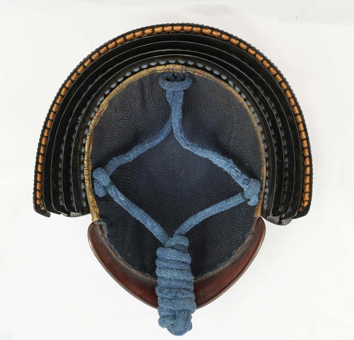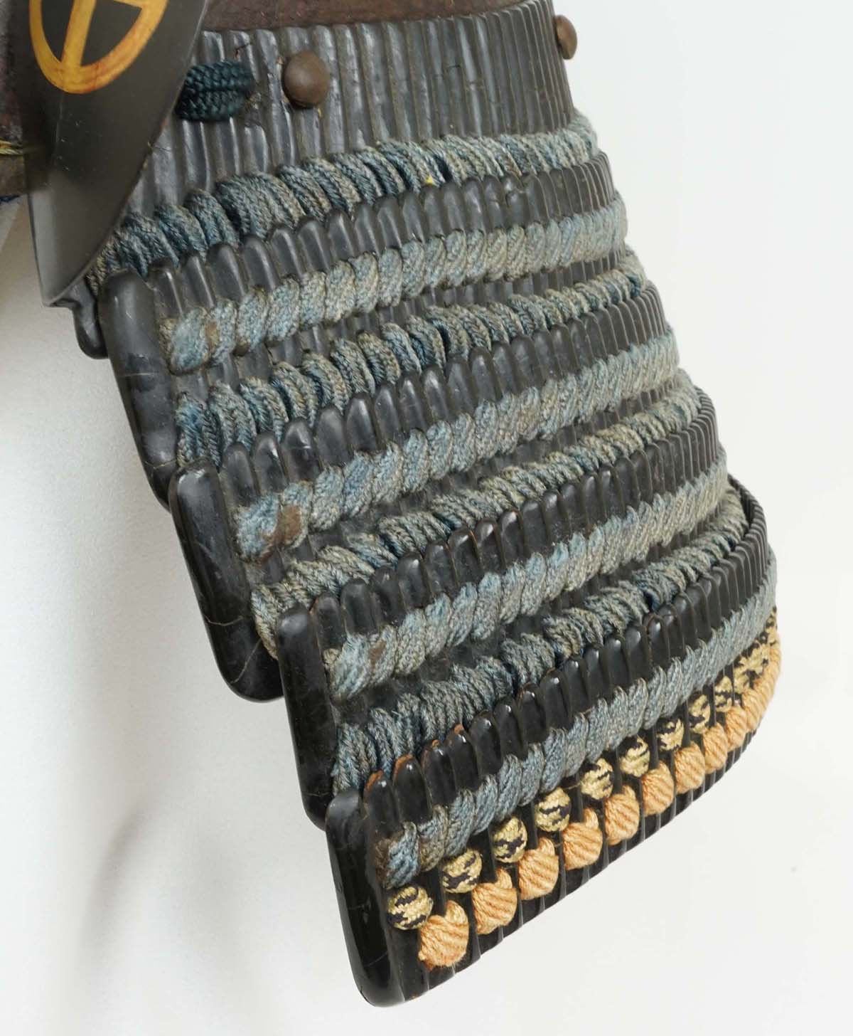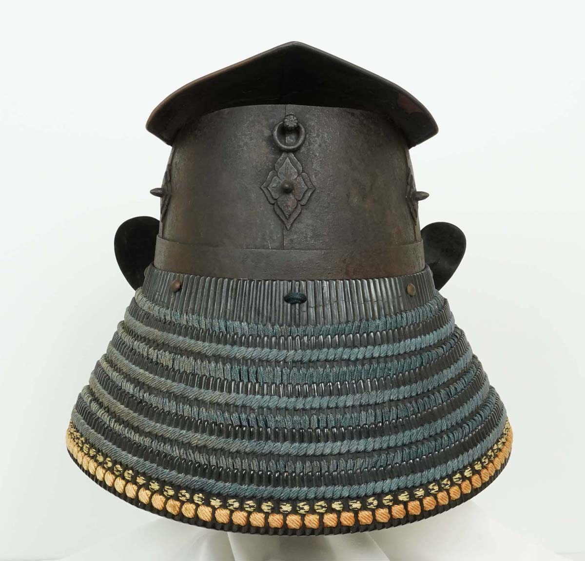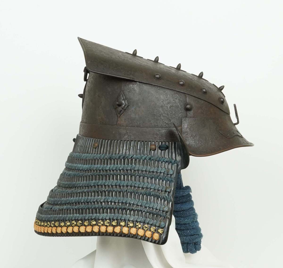 頭上に折り畳んだ手拭を置いたような形状から、置手拭形兜と呼ばれる変わり兜の一種で、主戦武器が火縄銃となる戦国時代に、高い軍事力を持った紀伊国の雑賀衆により製作されといわれます。 置手拭形兜は、火縄銃の弾丸を後方へ受け流すために改良された兜で、従来の兜よりも防御力に優れていました。 本作は両側面に三枚づつ鉄板を環状に継ぎ合わせ、その上に天辺の鉄板二枚を置き、鉄板の重なる部位に補強と装飾を兼ねた花菱模様の共鉄に、鋲頭を尖らせた五本の大型星鋲を力強く打ちます。 側面と後方にも大きさの異なる大型星座を三本打ち、頑丈に補強されています。 両側面の六枚の鉄板と天辺の鉄板の重なる部位にも、十本の丸鋲に座金を置き、大型鋲で鋲留を施しています。 眉庇には、雑賀兜鉢特有の切鉄(鉄片)による眉を打ち付け、吹き返しに武門の家紋を左右に据え、錣を鉄地黒漆塗日根野五段綴としています。 前立ての鍬形と中央の丸に十文字紋は、以前は金箔が施されており、前立台と鍬形は丸鋲で固定されています。 特筆すべきは、置手拭形兜の多くは、天辺の鉄板が後方に頭形に湾曲するのに対して、天上鉄板を湾曲させずに直線的にすることで、後方部分に隙間を設けて兜内の通気を良くする機能を設け又、天辺を斜め直線的にする視覚効果は、戦場に於いて猛々しく映り、自己を顕示するには充分な造形美も兼ね備えた異形な兜といえます。